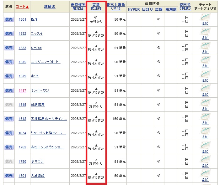 国内株式>銘柄検索>一般信用売り銘柄一覧 と進むと以下の表が出てきますので、