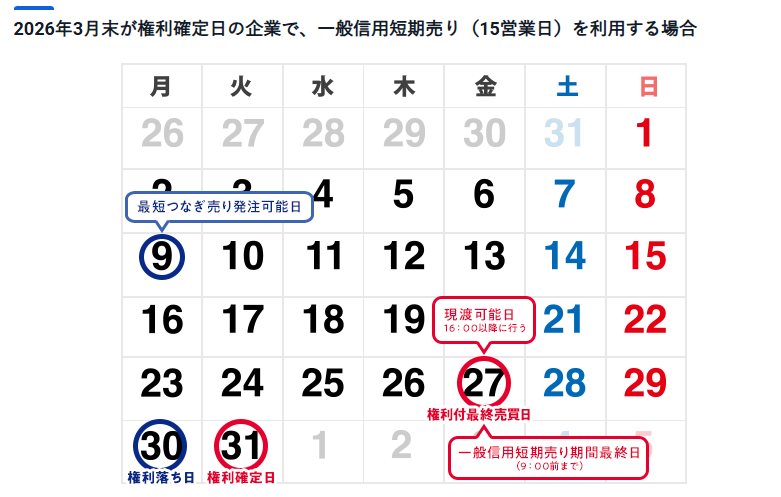 これは2026年3月末の予定です。このカレンダーだと、9日約定分からクロス取引が可能。