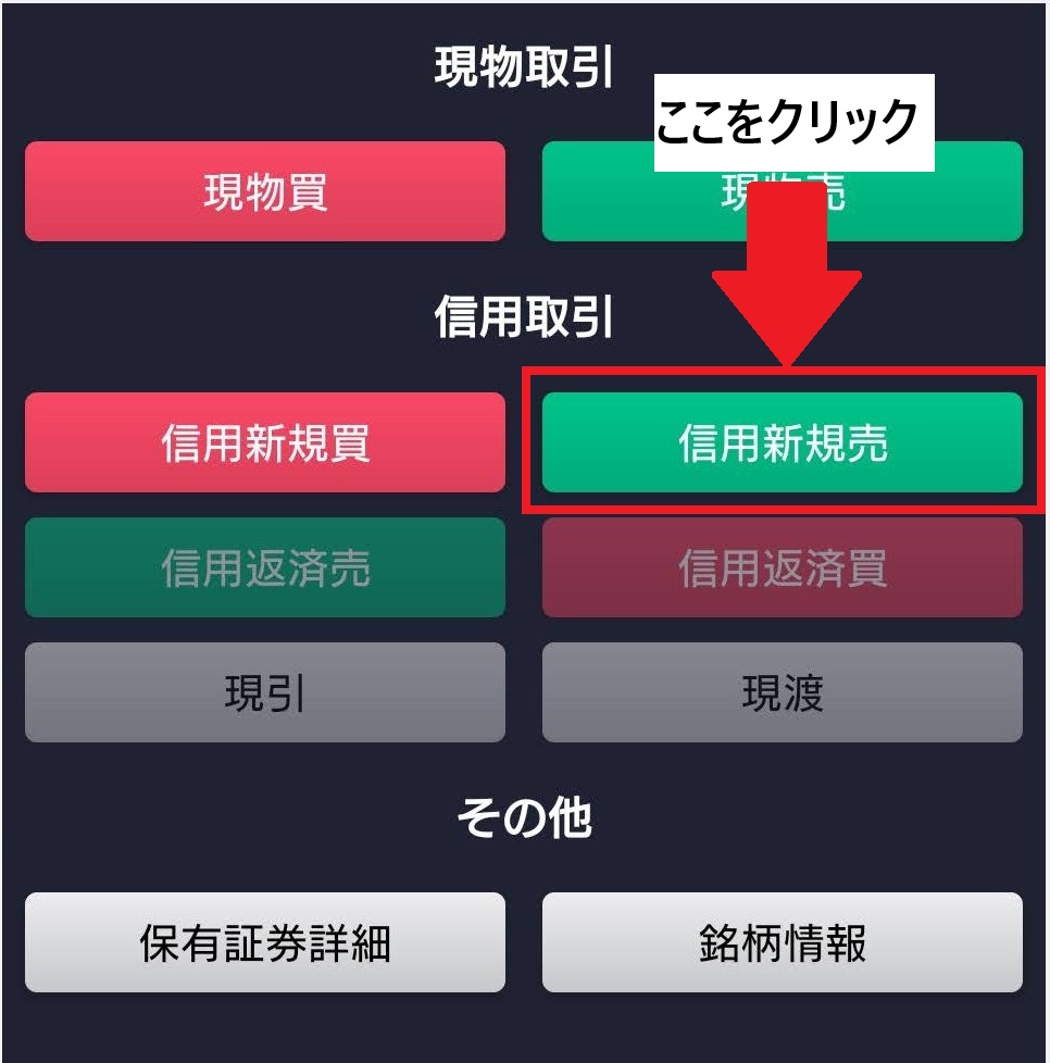 まず、「信用新規売」をクリック。