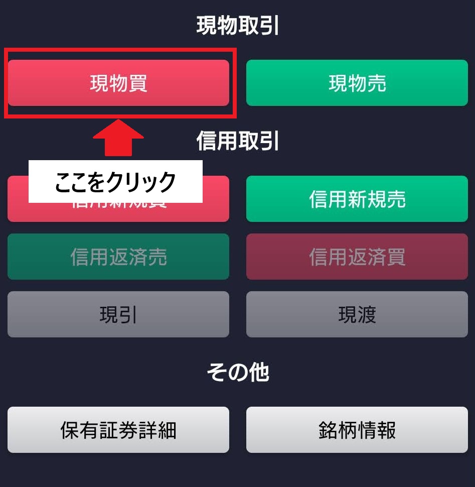 まず、先ほど売り注文した銘柄の「現物買」をクリック。
