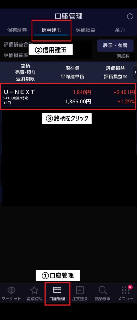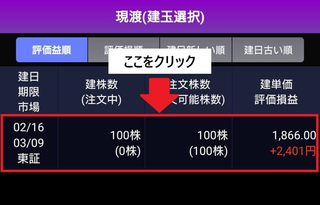 口座管理 > 信用建玉 と進み、現渡する銘柄をクリックします。